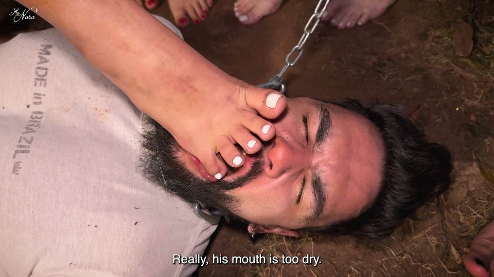 Under the cover of night, Mistress Nara, Vibora, Miss Bimby and Thay Flores drag their chained submissive Hex Fetish deep into a secluded, dirt-covered clearing. Barefoot and merciless, the four Goddesses are determined to make him taste just how filthy they can be. Their bare soles, already caked with soil, are pressed against his face, smeared across his pristine white shirt, and placed into his mouth for cleaning. They spit directly on his face, on the ground, and onto their own soles, mixing mud and saliva into a degrading paste he must lick away. As if that weren't enough, the women smoke and flick hot ashes into his open mouth, adding humiliation to exhaustion. By the end, Hex Fetish is drenched in dirt, spit, and ash, while their soles remain so deeply filthy they’ll need hours of punishment licking to get them clean... and they already know exactly who will do it. (EN-sub)