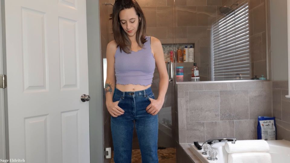 Sage Eldritch is standing in her bathroom wearing tight blue jeans and a crop top. She is desperate to pee as she models her denim pants. Watch as she wets herself in the jeans and then shows off the soaked pants front and back. Afterwards, she pulls her jeans down to show off her drenched panties