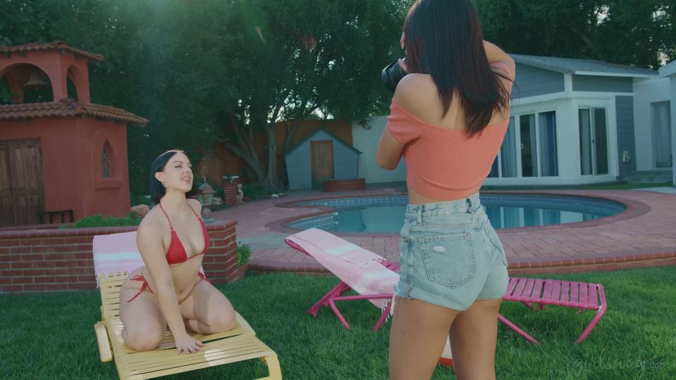 Two straight friends, Nicole Kitt and Lucy Lotus, arrive for a poolside photoshoot. But when they change into bikinis, the photographer, Natalie Brooks, gets hot and horny, encouraging them to get into sexier and sexier poses. She even goes so far as to suggest that the friends rub oil all over each other! The friends are taken aback at first but, feeling adventurous and hot themselves, they give in.This leads to Nicole and Lucy getting caught up in the moment and becoming aroused, so Natalie easily convinces them to kiss for a photo. Natalie is delighted and then encourages them to do a whole lot more than just kiss -- with HER included!